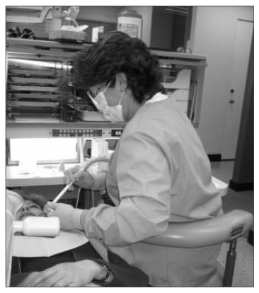 The proximity of the handpieces and instrument tray is an important consideration. The instrument tray should be directly in front of the assistant (Figure 12), preferably with knees underneath the tray. Too far of a reach will result in repeated extended reaching or forward leaning toward the area. All handpieces and instruments should be within a fingertip’s reach when the arm is comfortably extended, without leaning. Hoses on handpieces should be long enough so that excessive force is not necessary while working. One common mistake seen in the operatory is placing the instrument tray to the right of the assistant, necessitating repeated twisting to retrieve instruments.