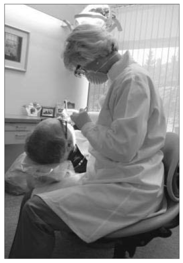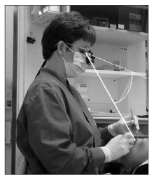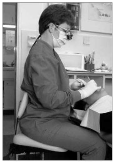 Seating considerations for the assistant in the operator position are somewhat different than those in assisting. Close proximity to the patient is an important and often difficult factor for the operator. Tilting the operator seat forward 10° to 15° places the hips higher than the knees and can help gain closer positioning to the patient by opening the hip angle. It also reduces low back disc pressure, helps maintain the lumbar curve, and may help prevent low back pain.19,20 The patient should be positioned low enough so that the assistant can work with neutral shoulder posture—that is, without abducting the arms away from the sides of the body. Forearms should be approximately parallel with the floor, the elbows relaxed at the sides. To operate in this optimal position, the patient will usually have to be placed at lap level, which may increase the visual distance. For this reason, assistants who frequently work in the operator position should consider purchasing magnification (Figure 14).