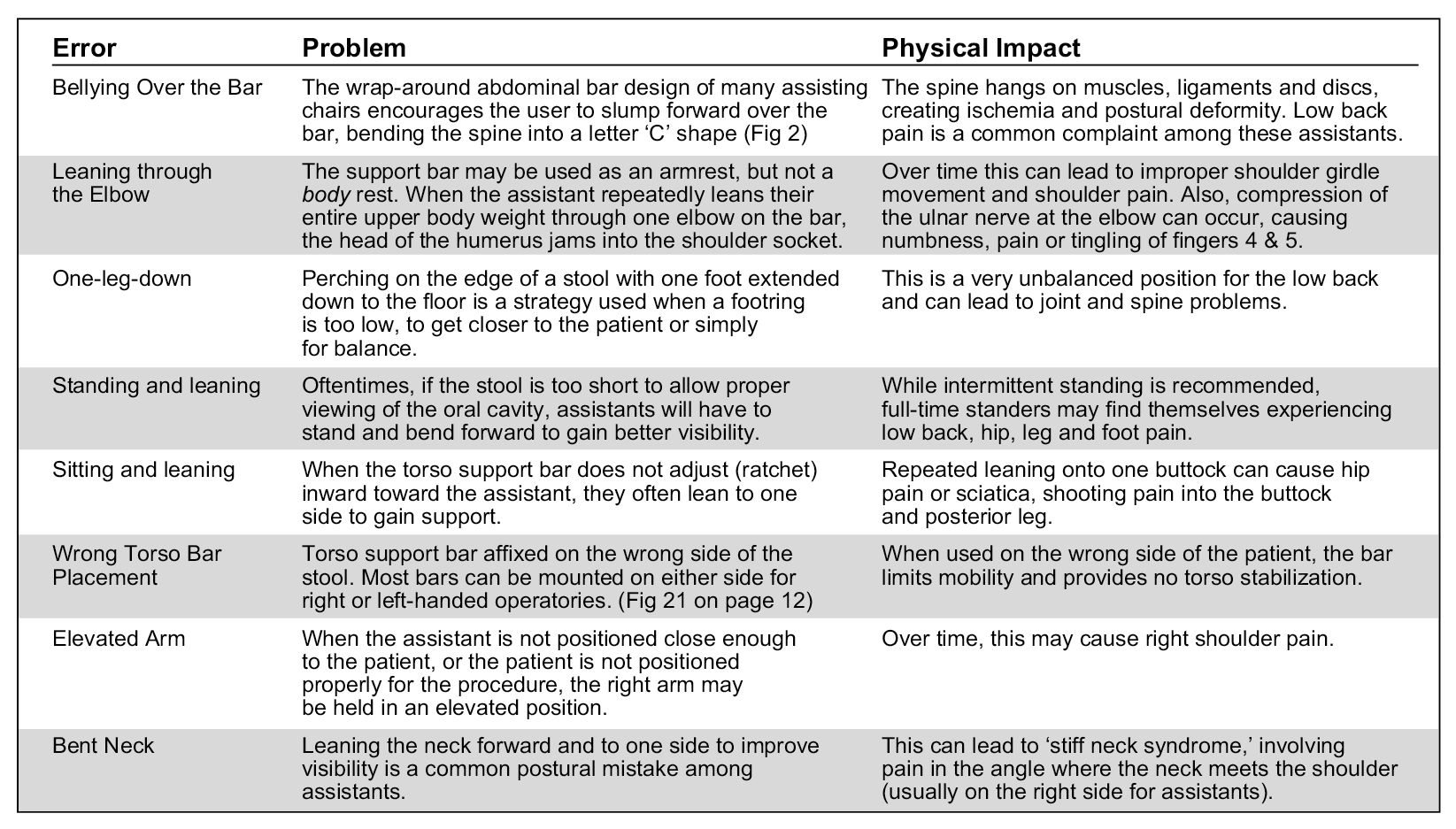 Features of dental assisting stools are varied: backrests only, torso support bars only, and those that have both a backrest and a torso support bar. It is probably due to this variety of assistant stools and the positioning challenges faced chairside that assistants have adopted such a wide array of seated postures. Unfortunately, many of these postures contribute to microtrauma that can lead to MSDs. Table 1 lists the most common seating errors and their impact on musculoskeletal health.