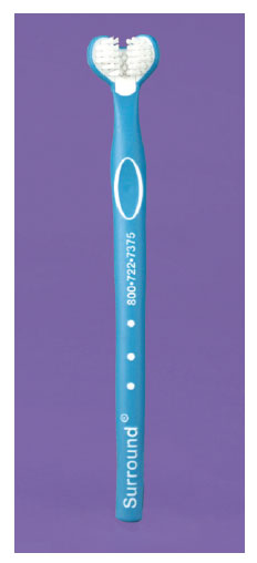 Solution: Use a compact head toothbrush for a better intraoral fit. An angle can be bent into the toothbrush handle by gently heating above a flame or by holding the handle under very hot water until it becomes pliable. A commercially available toothbrush, such as the Surround® Toothbrush with two opposing brush heads, shown in Figure 1 and Figure 2, is designed to clean the buccal, occlusal, and lingual tooth surfaces at the same time. The handle is extra long and curved to permit an easy, controlled grip.