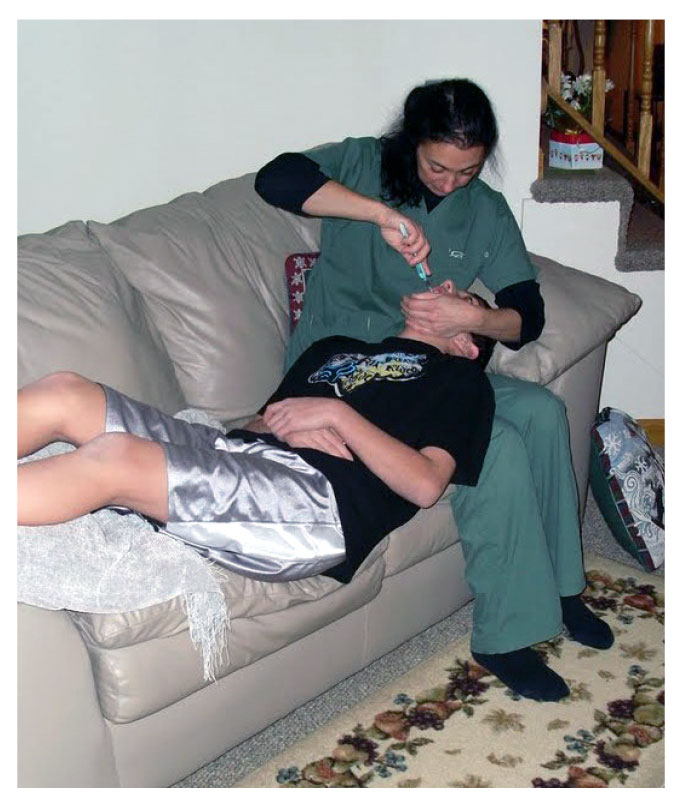 Whatever area is chosen, caregivers need to adjust their positions as necessary. If the patient is in a chair, wheelchair, sitting on the floor (Figure 10), or using a bean-bag chair, the caregiver should be positioned behind the patient. If the patient is lying on a couch, a pillow should be placed on the caregiver’s lap for the patient’s head to rest on (Figure 11). If the patient is in a bed, the caregiver should stand beside the bed. Turn the patient’s head to the side and place a towel under his or her chin. Have a basin ready for rinsing options. Before any care is attempted, first approach the patient from the front to explain the procedure.