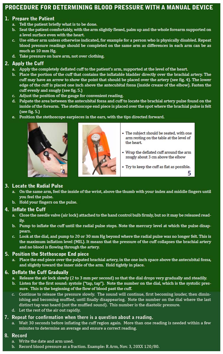 It is important that the patient always be in the same position using the same arm. Differences in body position and arm used can make a difference in the reading of 10mm Hg or more. Figure 4 presents a detailed, step-by-step rubric for successfully achieving accurate measurement.