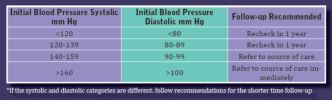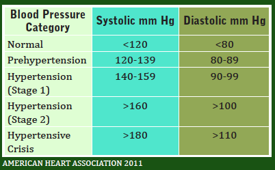 The American Heart Association recommends blood pressure screening occur starting at age 20. Blood pressure readings defined by the American Heart Association include normal, prehypertension, two stages of hypertension, and hypertensive crisis (See Table 1). Prehypertension is a designation meant to alert patients of a need to intervene and prevent hypertension. Patients in this designation have increasing health risks and need to make major lifestyle changes to return to a normal reading. If changes are not made, prehypertension will progress into hypertension - a serious health risk. Treatment options for hypertension usually require prescription medications and should be discussed, prescribed, and monitored by a physician.