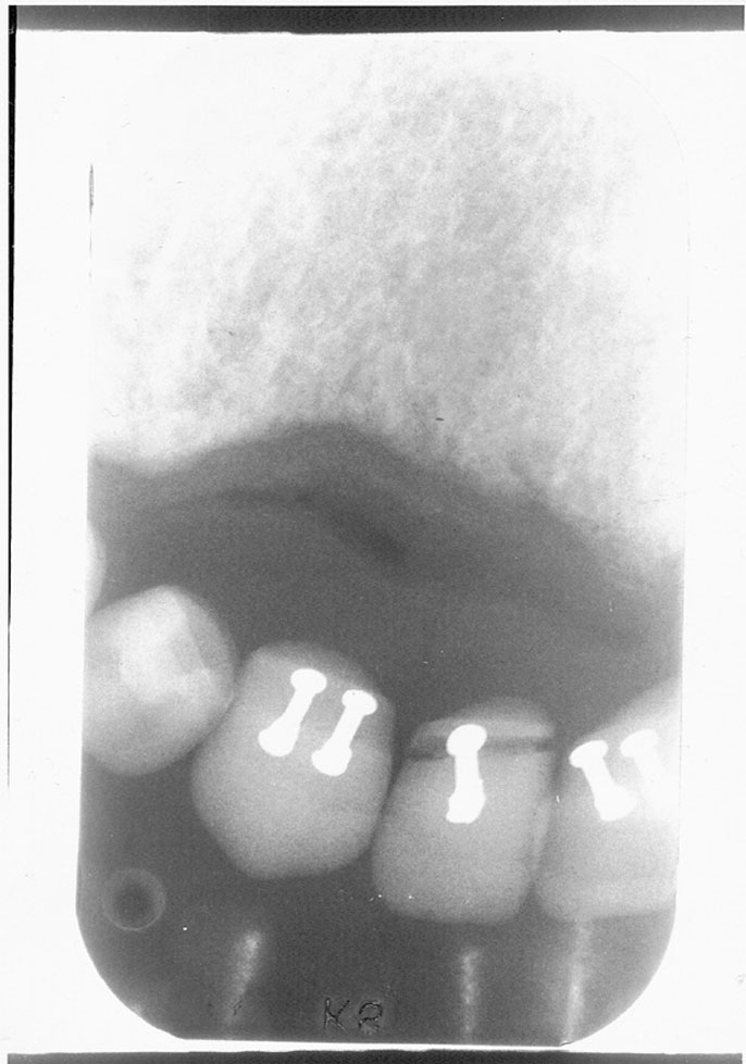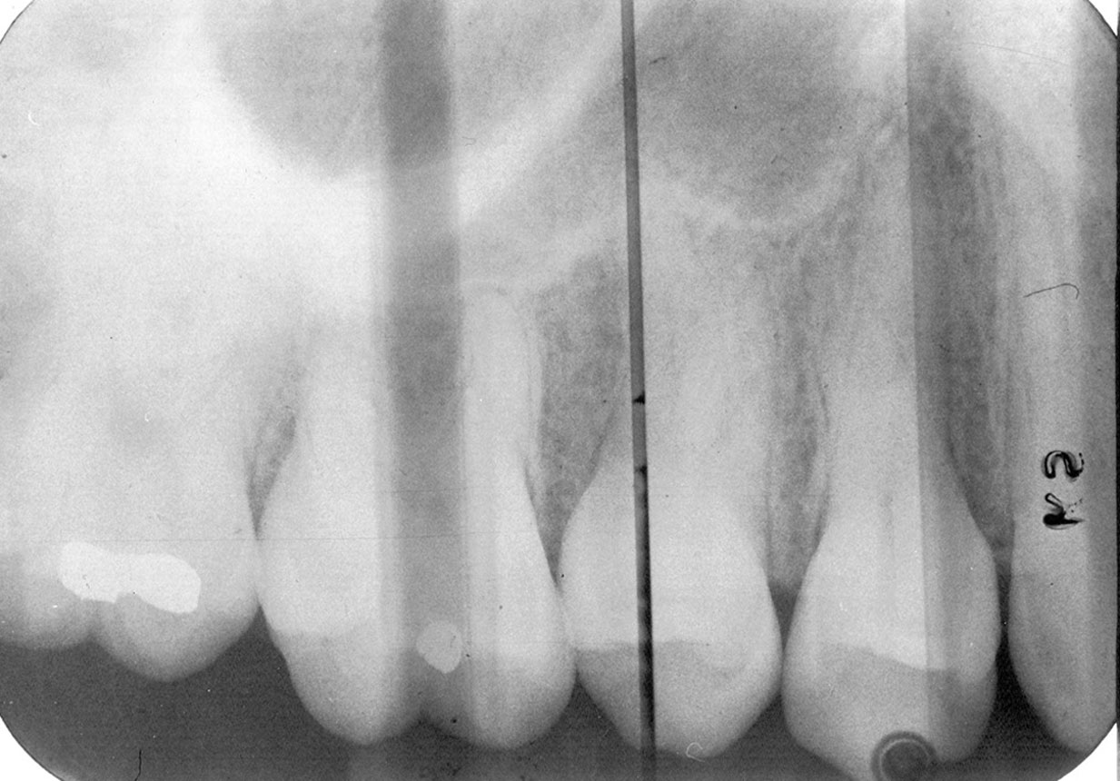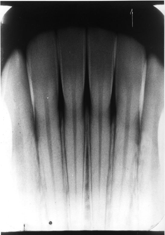 Similarly, placing the lead apron too high on the patient’s neck or bunching it at the shoulders will obstruct the beam enough to cast a ghost image of the shielding material (Figure 26). In order to equalize tissue densities, the patient’s tongue must be held against the palate. If it is not, the air space between the tongue and the palate will cast a detail-obscuring dark shadow or radiolucency at the apices of the maxillary teeth, with corresponding washed-out areas at right and left sides (Figure 27) related to the difference in density of the tongue in relation to the air space. Similarly, the patient’s lips should remain closed to equalize the densities.