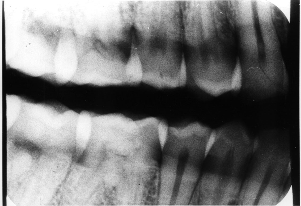 Differential Diagnosis: The light, droplet-shaped areas between the teeth indicate proximal overlap. The central ray or beam was not parallel with the interproximal surfaces. If the overlaps are larger in the posterior half of the film, the horizontal angulation was angulated too much from the mesial toward the distal. The reverse is true for a film in which the overlaps are larger in the anterior half of the film.