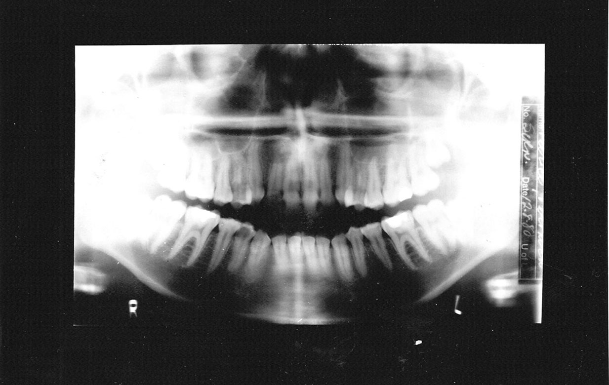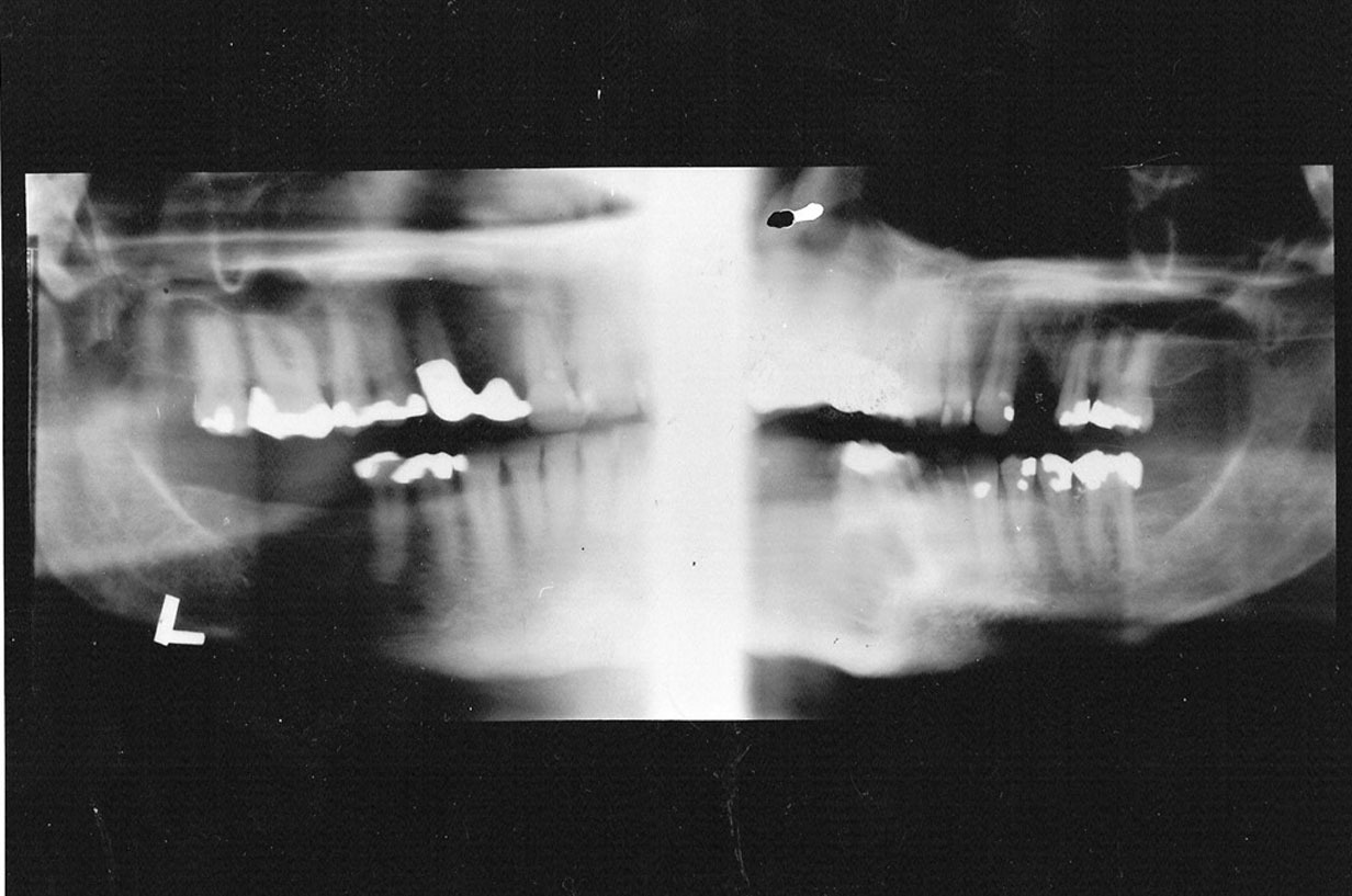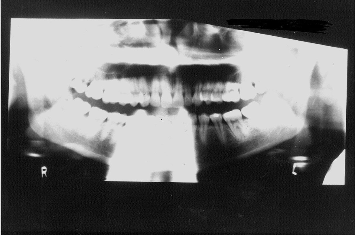 If the patient’s chin is tilted downward, the arches will appear constricted. The condyles will appear closer together and may be cut off at the top of the film. The overall appearance will be that of a “Cheshire cat grin” due to the accentuated curve of Spee (Figure 21). If the patient’s chin is tilted upward, the image of the arches will be one of overall flattening or elongation. The condyles will be farther apart and may be cut off at the sides of the film. The general appearance is that of a wide “grimace,” as in Figure 22, due to a flattened curve of Spee.