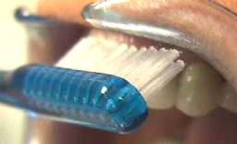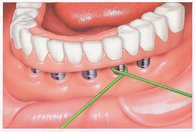 Various types of toothbrushes may be used to clean implant superstructures. Exposed facial and lingual areas of the dental implant, its fixed and/or removable prosthesis, and surrounding gingival tissues can be cleaned using a soft, multitufted, nylon toothbrush. There are many different brush handle angles from which to choose. The dental professional should assist the patient in choosing a handle that allows the patient to successfully access all areas of the oral cavity. The modified Bass technique should be used, or a short, horizontal back-and-forth movement can be employed. In the modified Bass technique, the brush is held at a 45-degree angle where the abutment post meets the gingival tissue (Figure 1). Patient tooth brushing techniques often miss cleaning the most lingual aspect of the titanium abutment cylinders, so patients must be instructed to give special attention to the lingual aspects.