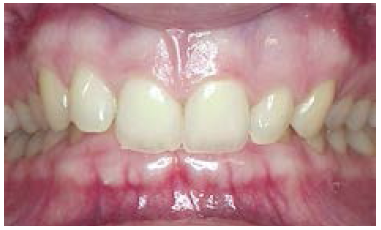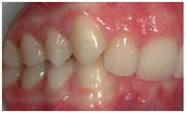The maxillary first molar is forward of the normal molar relationship in Class II. The mesiobuccal cusp of the maxillary first molar is mesial to the buccal groove of the mandibular first molar. In Class II Division 1 (Figure 2), the maxillary incisors are in labio-version, or protruding. In Class II Division 2 (Figure 3), the maxillary central incisors are in linguo-version (retruded) and lateral incisors are protruded. In Class III the maxillary first molar is distal of the normal molar relationship. The mesiobuccal cusp of the maxillary first molar is distal to the buccal groove of the mandibular first molar.