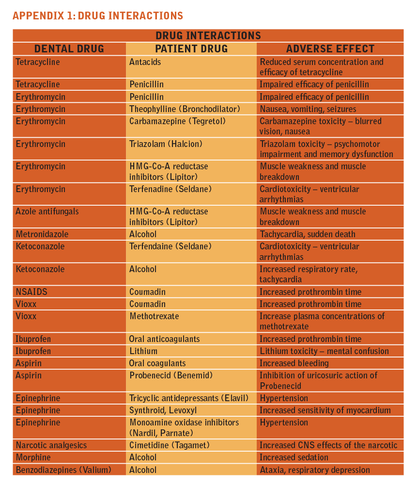 Prescription medications and all over the counter medications, vitamins, and herbal supplements should be listed with the medical history. Since adults are the leading consumers of multiple types of medications for various health conditions, the pharmacological implications of successful dental treatment must be carefully assessed. Certain medications may interact with some of the drugs used in the dental office, creating potential medical emergencies, especially if the dental team is unaware of the medication being taken. (See Appendix 1: Potential Drug Interactions) A complete and precise review of the medical history should be done at each appointment before treatment, even if the patient was in two weeks ago. Medications and medical conditions can change frequently; therefore, it is important to update the history at the start of each visit.