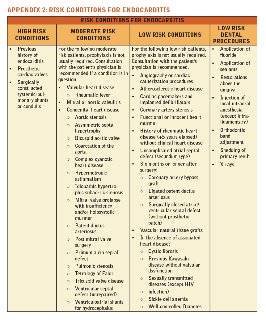 Many routine dental procedures, including ordinary brushing and flossing of teeth can release bacteria into the bloodstream. In most instances, the resulting bacteremia poses no threat and the body’s natural defenses attack and eliminate the invading microorganisms. Even in individuals who are endocarditis- susceptible, the bacteremia is usually eliminated by natural defense mechanisms. However, certain heart patients and joint replacement patients are vulnerable to the invading bacteria. Bacteremia in these patients can lead to infective endocarditis, a serious and often fatal condition. Even with the advancements of medical science, we are unable to predict with absolute certainty which patients will develop endocarditis or which procedures will be responsible for the infection. Therefore, every dental team member must identify patients with predisposing conditions and take measures to protect them from this condition. It is important to know which medical conditions put patients at risk and the relative severity of the risk. In the past, many dental patients were premedicated with antibiotics prior to certain dental procedures.