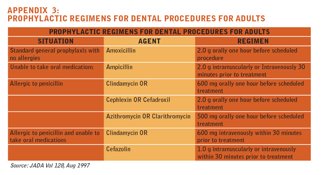 Knowing which dental procedures pose the greatest threat to susceptible patients is also important. Reduce the risk factor with careful planning and by educating the patient. The dentist in consultation with the patient’s physician will then choose the antibiotic regimen most appropriate for each patient. (See Appendix 3: Prophylactic Regimens) Occasionally, a patient with a total joint prosthesis may present to the dentist with a recommendation from his or her physician that is not consistent with the new guidelines; this could be due to lack of familiarity with the guidelines or to special considerations about the patient’s medical condition that are not known to the dentist. In this situation, the dentist is encouraged to consult with the physician to determine if there are any special considerations that might affect the dentist’s decision on whether or not to premedicate. Following the consultation, the dentist may decide to follow the physician’s recommendation or, if in the dentist’s professional judgment antibiotic prophylaxis is not indicated, may decide to proceed without antibiotic prophylaxis.