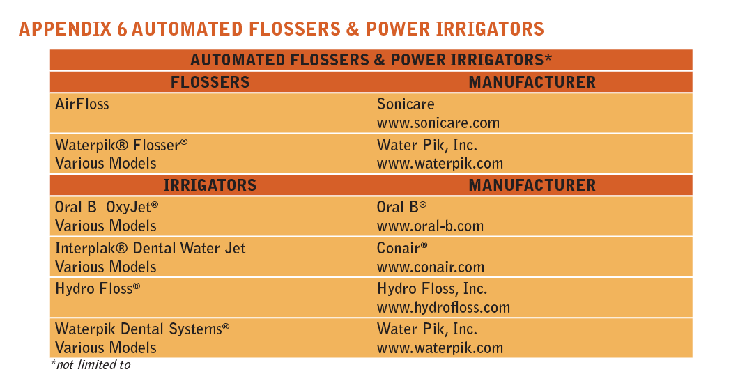 If the patient has the necessary interest and skills, flossing can be taught or reinforced. A floss holder can be a useful device if the patient’s manual dexterity is limited, or a mechanical flossing device is also acceptable. Floss holders can also be inserted into alternative handles. (See Appendix 6: Automated Flossers)