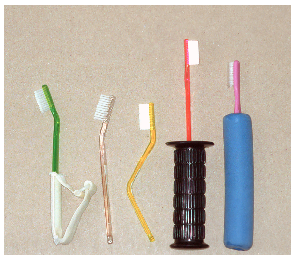 The instruction and home care regime of the physically challenged patient will depend on the type and severity of the disability. The individual who has a mild physical or mental disability can be taught a simple brushing technique, such as the Fones or press and roll method. Bicycle grips, tennis balls, and Styrofoam molds with the handle of the toothbrush placed inside can be used as alternative brush handles for the patient with decreased manual dexterity (Figure 3). There are several types of toothbrushes on the market and some can be personalized to meet patient needs. By bending a plastic handle under hot water, the angle of the brush can be adjusted to counterbalance the disability. Supervision by the parent or caregiver may be required at one of the daily brushings, preferably the evening one. The more seriously impaired patient may be instructed in the use of an electric toothbrush. (See Appendix 5: Mechanical Toothbrushes) The patient should be encouraged to brush his or her own teeth during the day. This will help to reinforce the concept that the teeth should be cleaned twice daily and to give the patient a sense of responsibility for his or her own care.