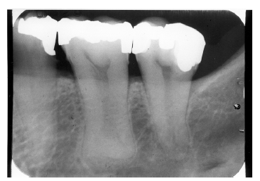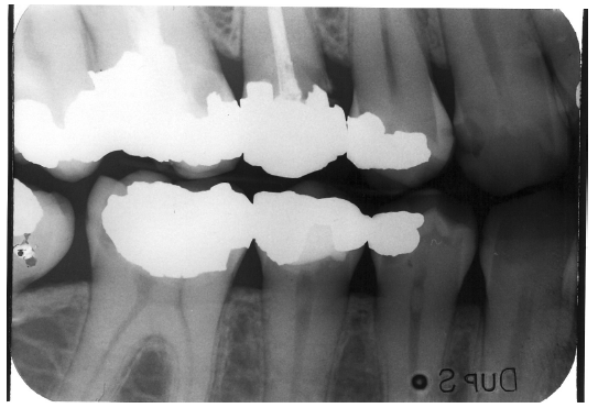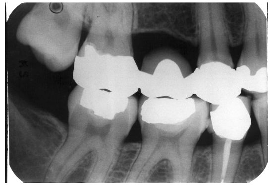 Figure 1 is a molar bitewing radiographic image that discloses a defective abutment restoration on tooth #4. The restoration ends short leaving open margins.