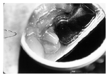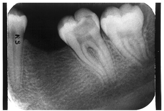Following normal tooth extraction, the extraction socket is clearly demarcated by the radiopaque bundle bone into which the periodontal ligaments had anchored the tooth. A radiographic image of a recent first mandibular molar extraction site is illustrated in Figure 17. Note the clear outline of the root socket.