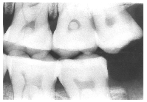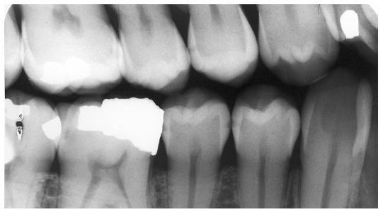 Figure 5 illustrates cervical burnout in a premolar bitewing radiographic image. Note that the cementoenamel junction and the crest of the alveolar bone lie respectively just above and just below the burnout area. As a point of comparison, note the interproximal enamel caries on the first and second premolars.