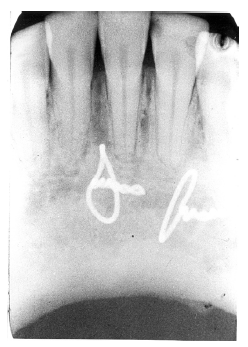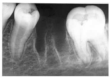 Clinically, the extensive bone loss and gingival recession of advanced periodontal disease may be easily visualized. In less advanced cases, the periodontal probe can be used to measure the distance between the gingival crest and the periodontal attachment. Bleeding at the point of probing and measurement of significant distances are strong indications of periodontal disease. Figure 6 radiographically illustrates probe depth in a case of moderate periodontal disease with early alveolar bone loss.
