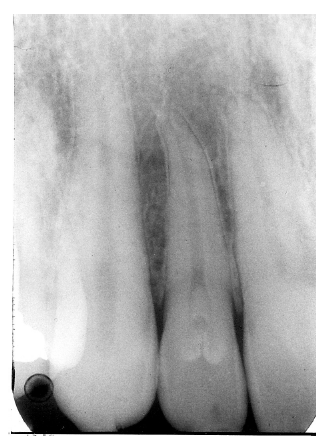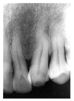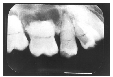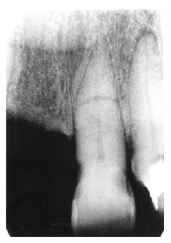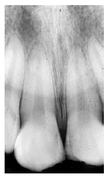 Figure 13 illustrates apical periodontal pathosis in the area of the right central incisor. Note the loss of continuity of the lamina dura and the widened periodontal ligament space on the affected side.