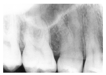 The chronic periapical abscess represents a suppurative process that has been present long enough to cause the body to resorb bone. It is not possible to absolutely differentiate between a chronic abscess, dental granuloma, or small radicular cyst solely by using a dental radiographic image. However, a radiographic image of multiple foraminae (many openings or passages) within the pathological area is strongly suggestive of sinus tract formation and drainage of pus. Notice the four prominently radiolucent foraminae in the resorbed periapical area in Figure 12.