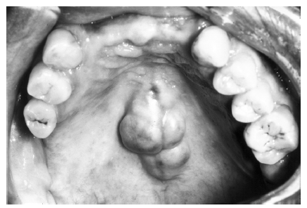 The maxillary torus presents as a hard, frequently lobulated, benign overgrowth of mature lamellar bone. It is frequently located in the midline of the hard palate (Figure 60) and attached by a broad, bony base.