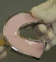 Alginate trays are available in a variety of sizes: extra small, small, medium, large and extra large. Some manufacturers label the trays by number to identify size. The smaller the number the larger the tray. Full maxillary and mandibular trays are supplied in metal, plastic or Styrofoam. Perforated disposable trays are made of plastic and are indicated for “single use.” Perforated trays are recommended because the alginate material flows through the holes, or perforations, which provide a mechanical lock of the alginate to the tray. This mechanical lock ensures that the alginate and the tray are removed from the patient’s mouth as one unit. Solid or perforated metal impression trays must be cleaned, packaged and sterilized prior to reuse. The operator should try each mandibular and maxillary tray in the patient’s mouth to ensure a proper fit before the alginate impression is taken. The impression tray “try in” also provides the patient with a preview of how the tray will fit and feel once it is placed in the oral cavity. NOTE: All trays that are tried in the patient's mouth but do not fit correctly must be sterilized prior to restorage.