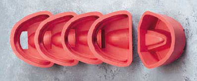 Rubber Model Base Former: A separate mix of gypsum is made with a W/P of 2:5. With the vibrator on low and the rubber base former resting on the vibrator platform, fill the commercial base former with plaster. Invert the initial pour onto the gypsum in the mold making certain that no voids exist between the initial pour and the base material. The advantage of using a model base former is that it eliminates time-consuming model trimming.