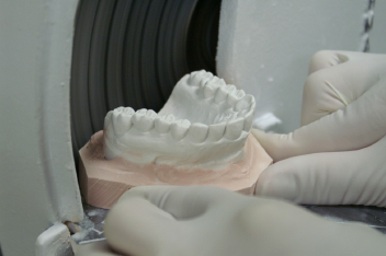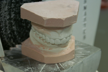 1. Place the base of the maxillary model on the table of the model trimmer, which is preset at 90 degrees.