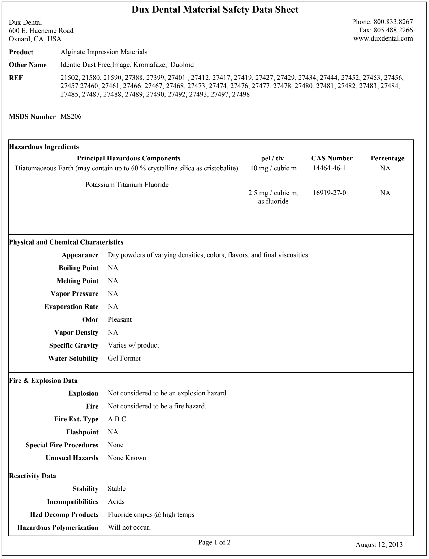 Alginate powder may be supplied in regular or dustless forms. Dustless powder is manufactured in an effort to reduce harmful effects to the operator. However, this does not eliminate the need to wear Personal Protective Equipment (PPE) during this procedure. The operators must protect themselves from adverse reactions by wearing personal protective equipment, such as masks, protective eyewear, gowns and gloves, when handling alginate. Without the use of PPE, minute dust particles may be inhaled into the lungs. Prolonged exposure may lead to respiratory problems and/or allergic reactions. The dust can also migrate behind contact lenses and irritate the eyes. The manufacturers of alginate must supply Safety Data Sheets (SDSs). In accordance with OSHA's regulations, the employer is required to maintain SDS sheets in a reference file for employees to access at will. The operator should read the SDS sheets prior to handling alginates, paying special attention to the Health Hazard Data section (Figure 1 and Figure 2).
