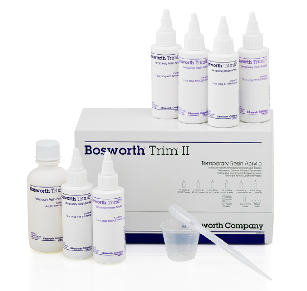 Bis-acrylics are multi-functional methacrylate esters filled with glass and/or silica particles. Bis-acrylic materials are popular because of their easy manipulation and comfort for the patient. They produce minimal odor, heat and shrinkage during the polymerization process. Shade variations are somewhat limited, ranging from two to five shade options.