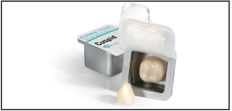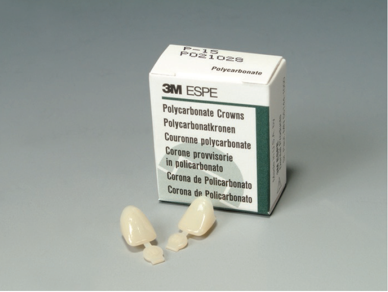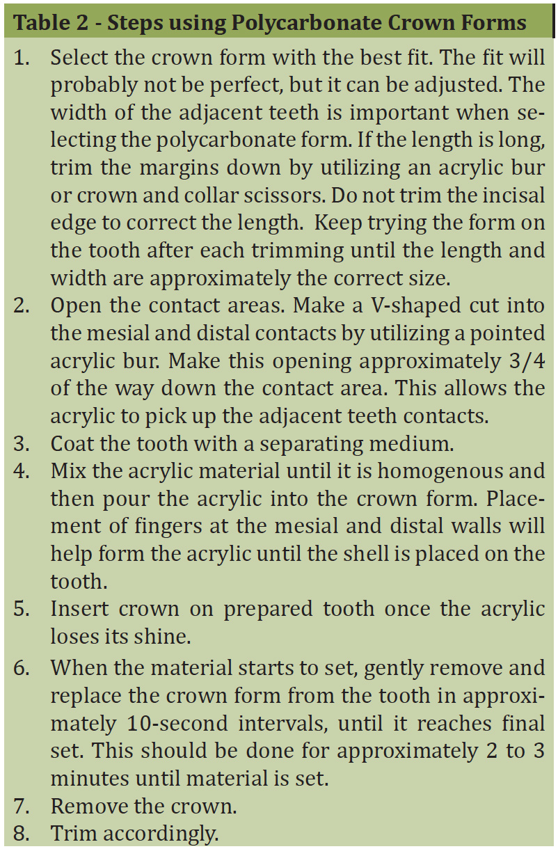 Polycarbonate Crown Form Technique. A polycarbonate crown is a tooth-colored plastic form that comes in a variety of sizes. This technique may only be used for single units. The technique described does not involve using the crown form by itself, but requires relining it with acrylic. However, a preformed acrylic crown can be used without relining, if it is properly trimmed and cemented with provisional cement. (Figure 5, Table 2)