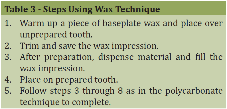 Wax Technique. This technique can be used to easily fabricate all single-unit provisionals. No crown forms or alginate impressions are necessary, which make this technique fairly inexpensive. (Table 3)