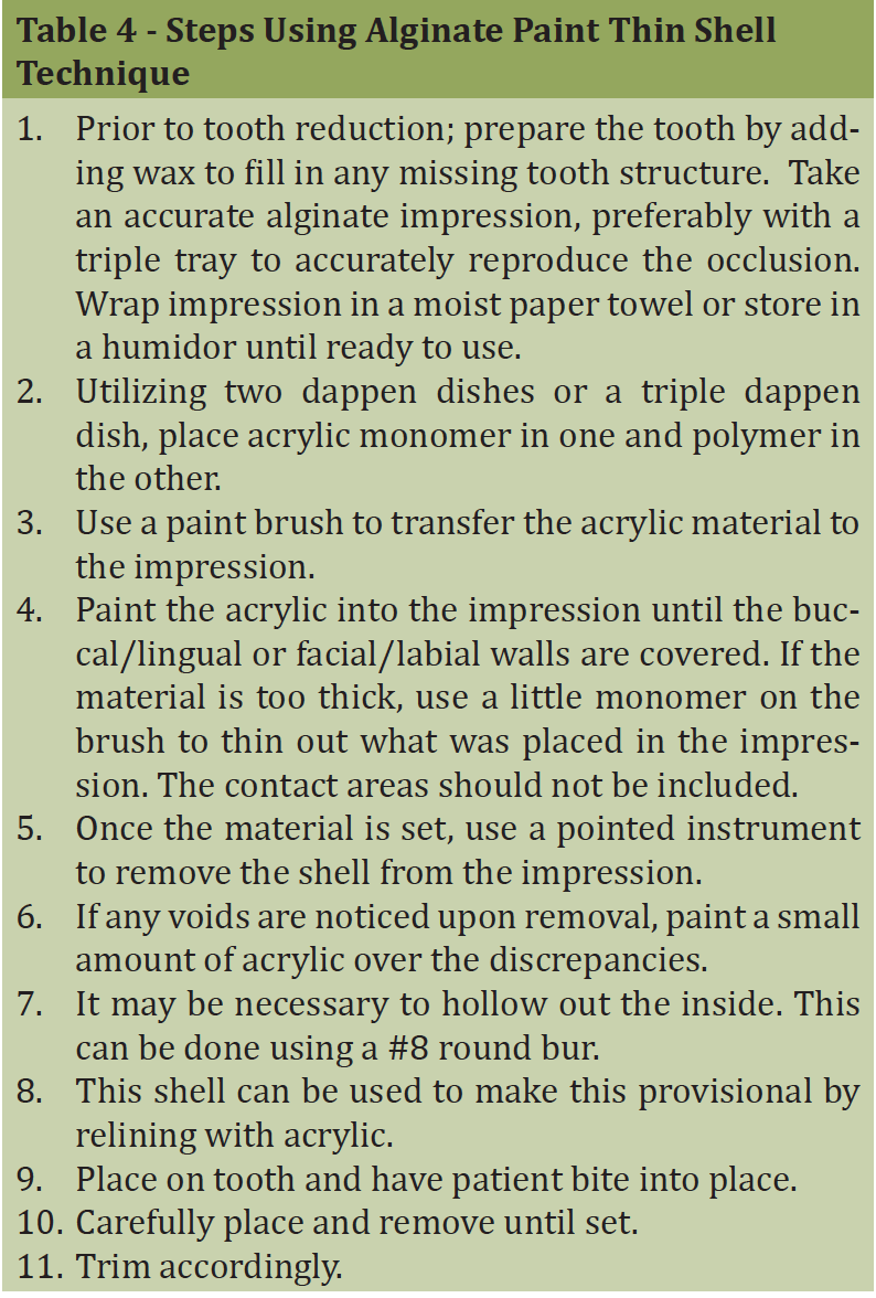 Alginate Paint Thin Shell Technique. This technique utilizes an alginate impression prior to the tooth preparation. If an impression cannot be obtained, this technique cannot be used. (Table 4)