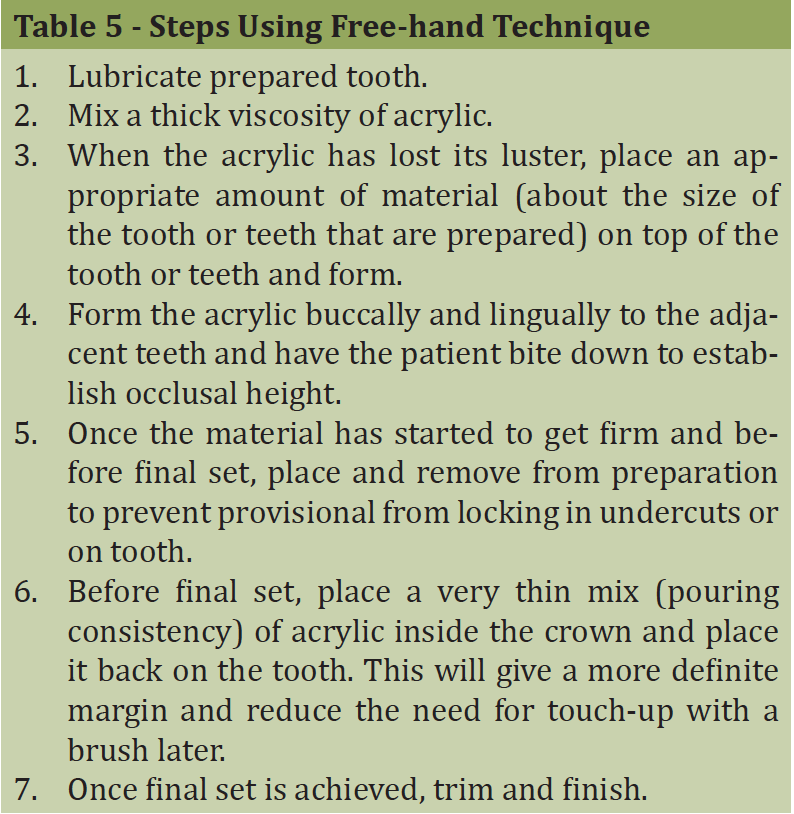 Free-hand (Block) Technique. The free-hand technique can be chosen when the assistant has become more skilled at making a provisional. No matrices or impressions are used with this technique. It allows for good marginal adaptation and proper occlusion. (Table 5)