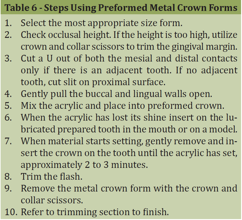 Preformed Metal Crown Technique. Aluminum, gold anodized, and stainless steel crown forms all fall into this category. They come in a variety of sizes for premolars and molars. They can be used by themselves, relined with acrylic or a combination of both. These crown forms cannot be utilized for multiple units. They can provide all the requirements of a well-made provisional when prepared properly. The technique utilized for these crowns is a bit different than what the dental team may be used to. The gold anodized forms seem to work the best for this technique because of the softness of the material. (Figure 6, Table 6)