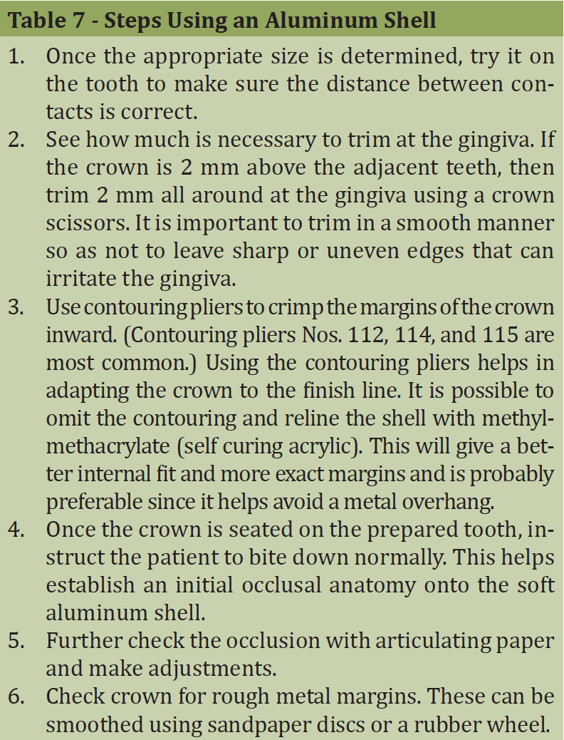 Aluminum Shell Technique. A posterior tooth can be protected by an aluminum provisional crown. These are available in a wide range of sizes. Always remember that crowns tried and not used must be sterilized before reuse. A millimeter ruler can be used to determine the size, measuring the mesial-to-distal distance. (Table 7)