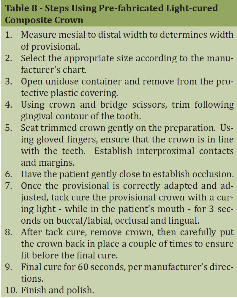 Pre-fabricated Light-cured Composite Crown Technique. These crowns are malleable, light cured, preformed, and are available in a variety of shapes and sizes. They are a simple and esthetic solution for posterior provisionals. These types of tooth-colored pre-fabricated crowns can be quickly adjusted prior to light curing. With no impression or matrix needed, fabrication is quick and relatively easy. (Figure 7, Table 8)
