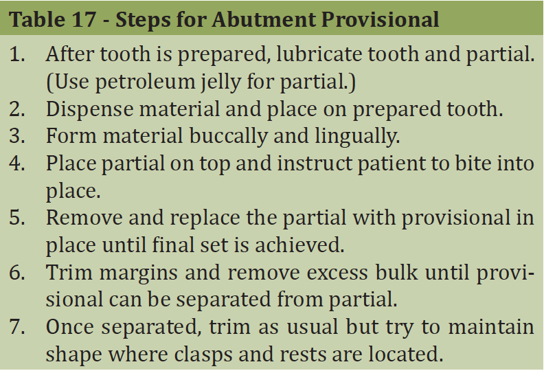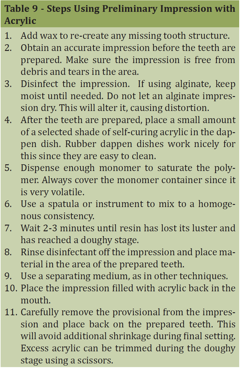 Acrylic Preliminary Impression Technique. This procedure requires an accurate impression prior to and after the tooth preparation. If the tooth is broken down, or a bridge is being constructed to replace a missing tooth, this technique may not be effective without adding wax to those areas. (Table 9)
