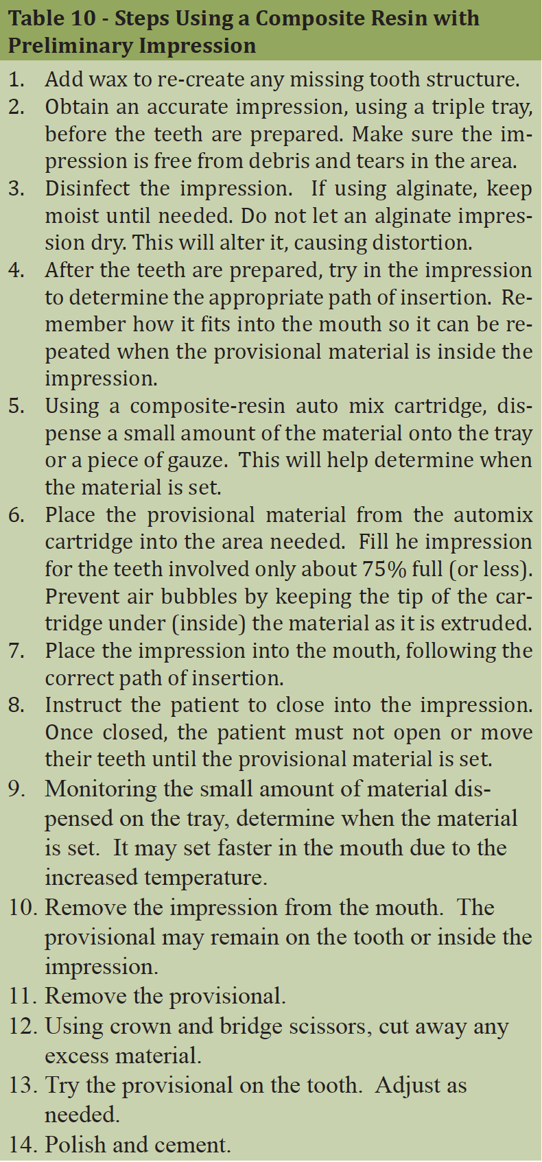 Composite Resin Preliminary Impression Technique. This procedure requires an accurate impression prior to and after the tooth preparation. If the tooth is broken down, or a bridge is being constructed to replace a missing tooth, this technique may not be effective without adding wax to those areas. (Table 10)