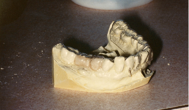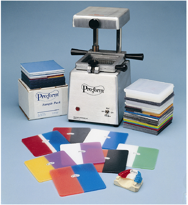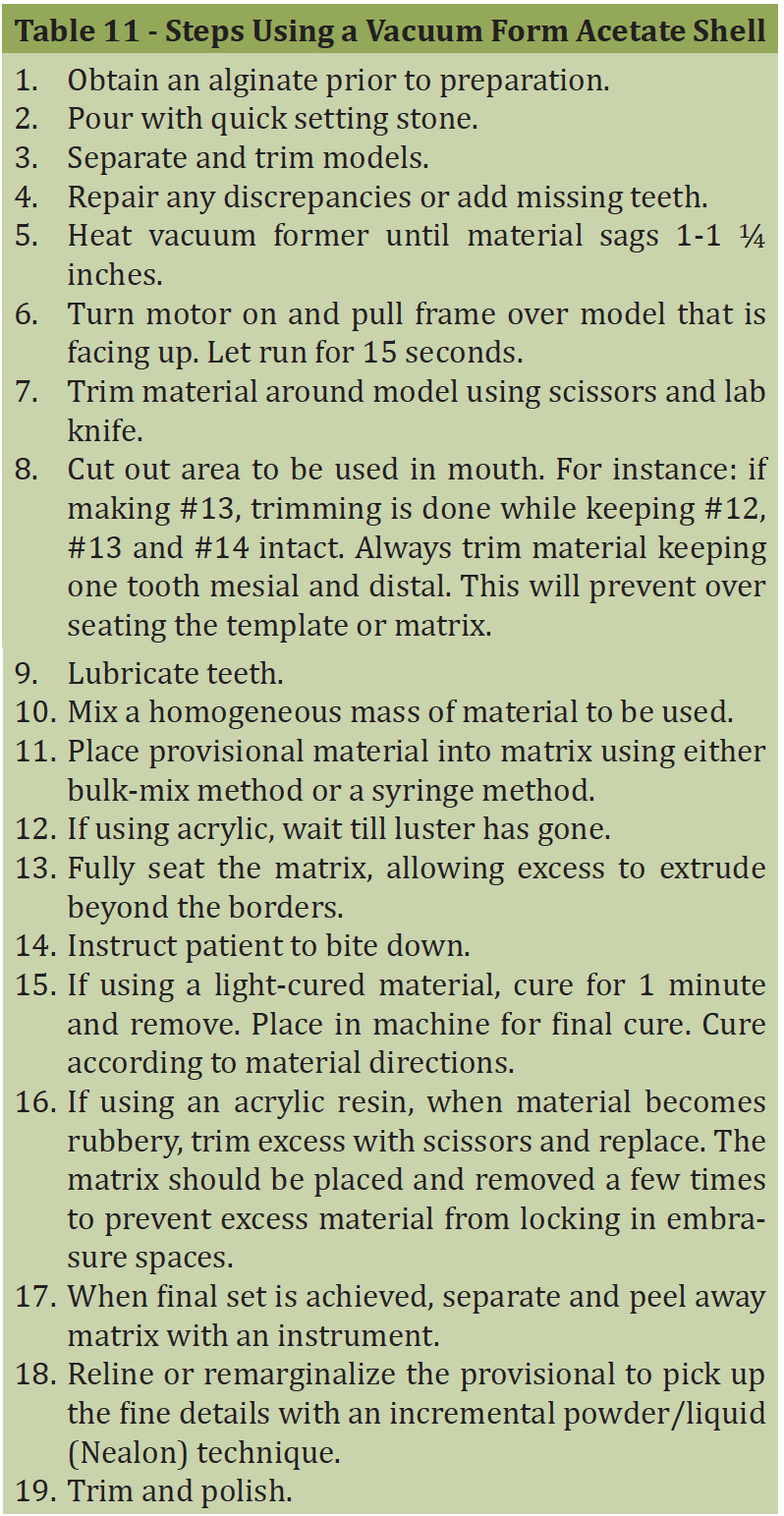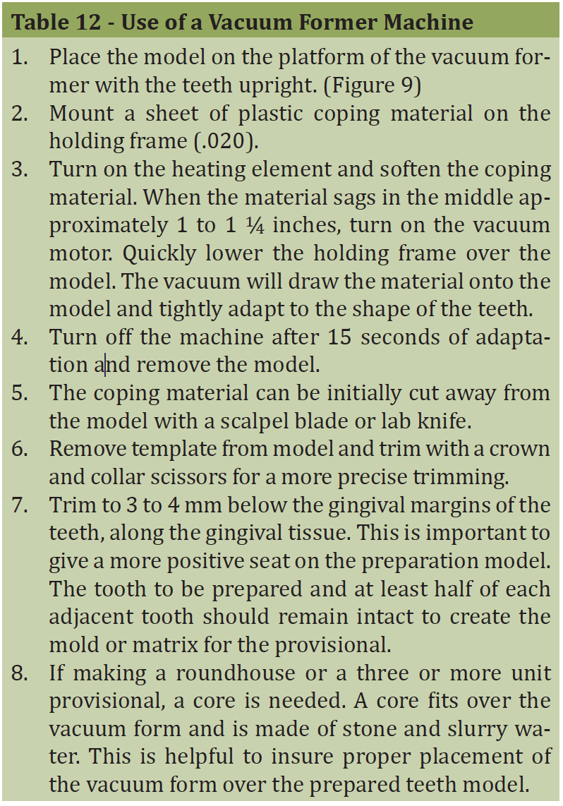 Vacuum Form Acetate Shell Technique. This procedure utilizes the vacuum forming machine. It allows for the duplication of existing teeth prior to preparation. However, it also duplicates broken or missing portions of the teeth. Therefore, after the alginate is taken and poured, repair any existing discrepancies prior to using the vacuum former. If a tooth is missing, there are many ways to fill the space prior to making the template. They include: use of an acrylic tooth (denture tooth), use of a mix of acrylic formed using opposing model to establish occlusion, and the use of light-cured resin to form a tooth (Figure 8). (Table 11, Table 12, Figure 9)