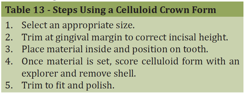 Celluloid Crown Form Technique. A celluloid crown form can be used to fabricate a single-unit provisional. It is extremely helpful when using light-cured materials because the material can be cured through the clear form. (Table 13)
