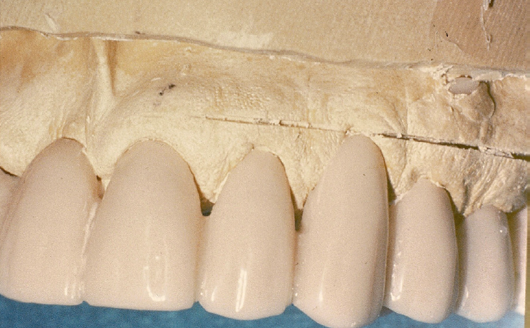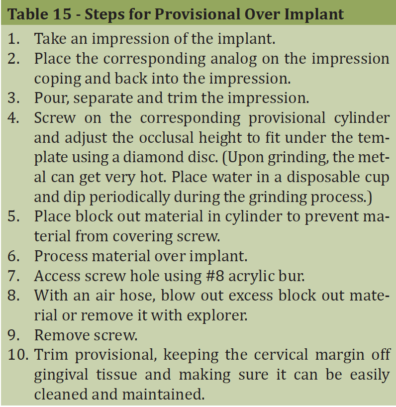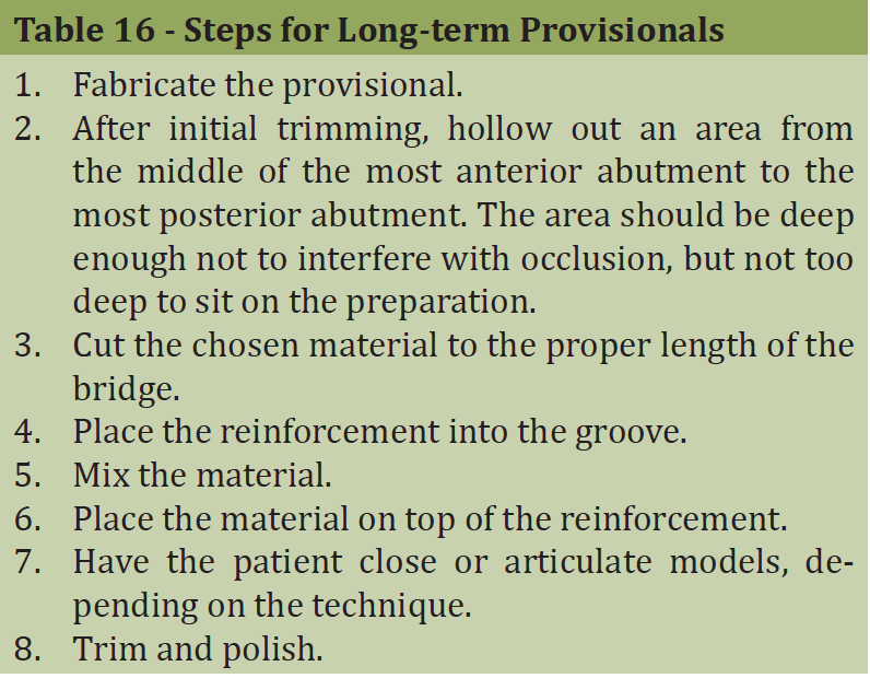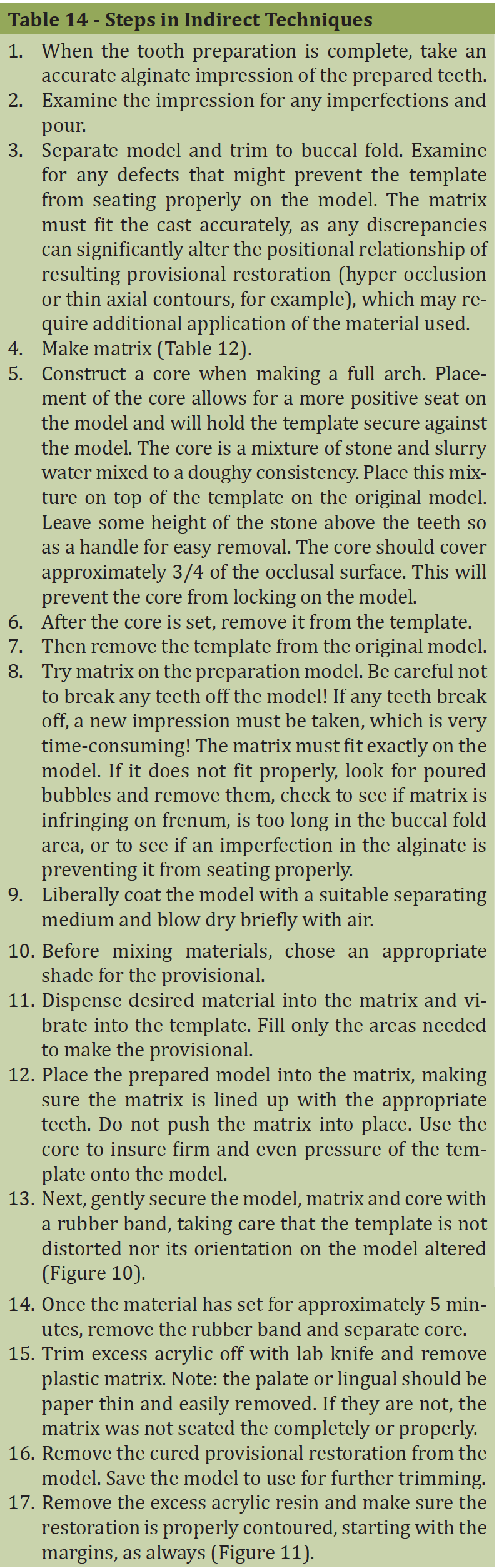 The indirect fabrication of provisional restorations has several advantages over the direct technique. The main advantage is that the patient does not have to keep their mouth open during the fabrication of the provisional. In addition, if acrylic material is used in fabrication, injurious effects of applying acrylic monomer to the tooth are eliminated, the patient is not subjected to the unpleasant odor and taste of the acrylic resin materials, and the resin is allowed to completely cure under pressure on a cast of the prepared teeth. This results in a well-fitting, nonporous provisional restoration. The indirect technique is the most effective technique to fabricate a large, multiple-unit provisional. (Table 14, Figure 10, Figure 11)