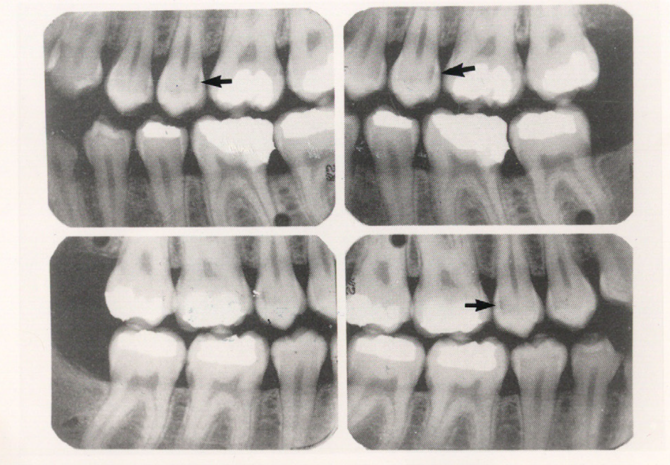 Bitewing examinations were introduced by Dr. Raper in 1925. Bitewing images focus on the clinical crowns of both the maxillary and mandibular teeth. Bitewings do not show the apices of the tooth and cannot be used to diagnose in this area. The greatest value of bitewing radio- graphic images is the detection of interproximal caries in the early stages of development, before it is clinically apparent. The arrows in Figure 2 indicate areas of interproximal caries. Bitewing images also reveal the size of the pulp chamber and the relative extent to which proximal caries have penetrated.