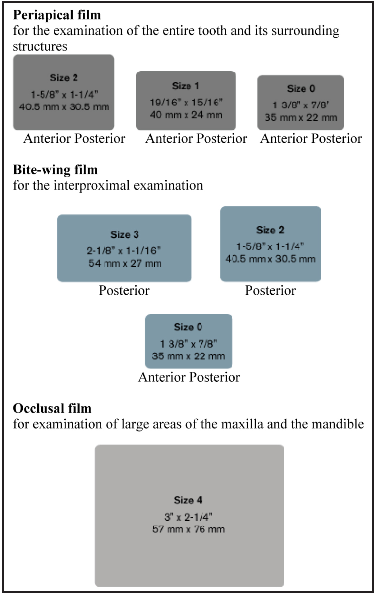 The selection of receptor sizes used in a full mouth series also varies. A full survey can consist of narrow anterior (type 1); standard adult (type 2); type 2 bitewing or long bitewing (type 3) (Figure 4) and may include anterior bitewings. It is generally recommended to use twenty radiographic images --- four bitewings and sixteen periapical images. Eight anterior type 1 radiographic images will allow for ease of receptor placement on patients with narrow palates. However, in some cases six anterior periapical images will cover the area needed.