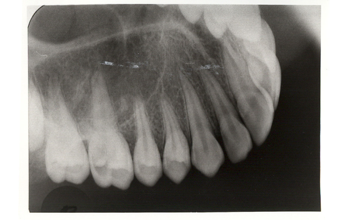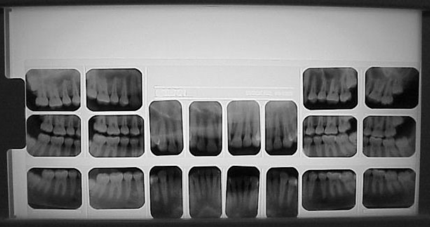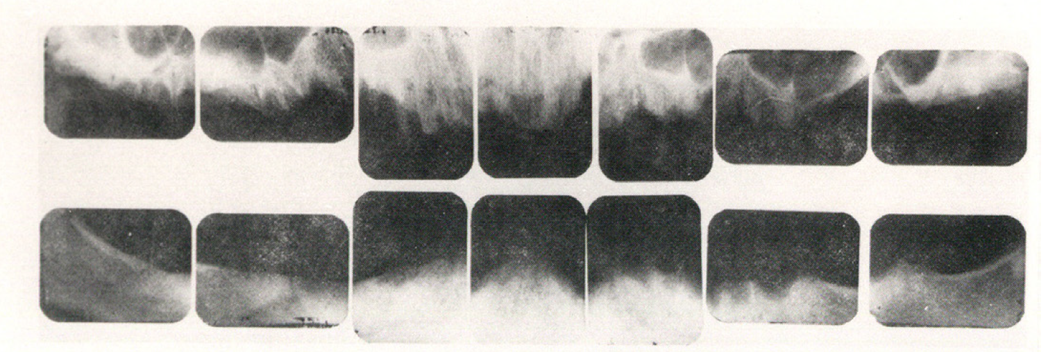 A fourteen or sixteen intraoral periapical survey, as seen in Figure 7, will usually examine the tooth bearing regions in most edentulous patients. Bitewings are not needed because there are no interproximal areas to be examined.