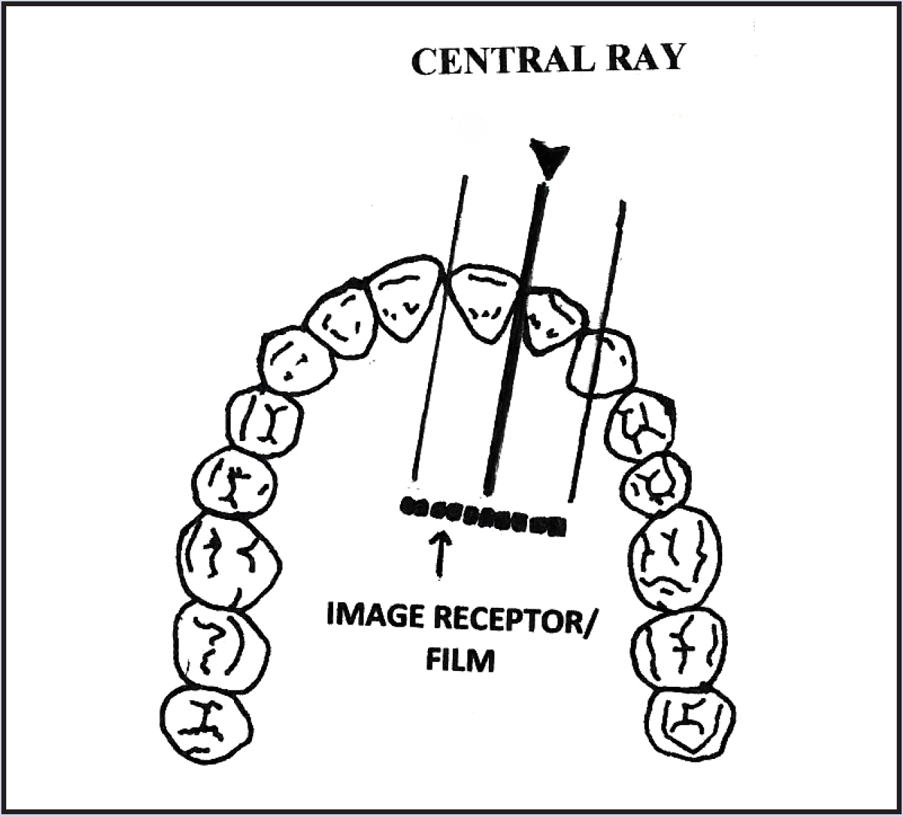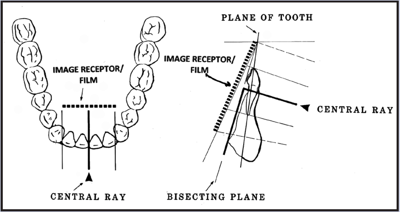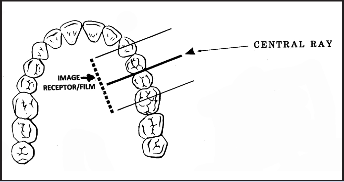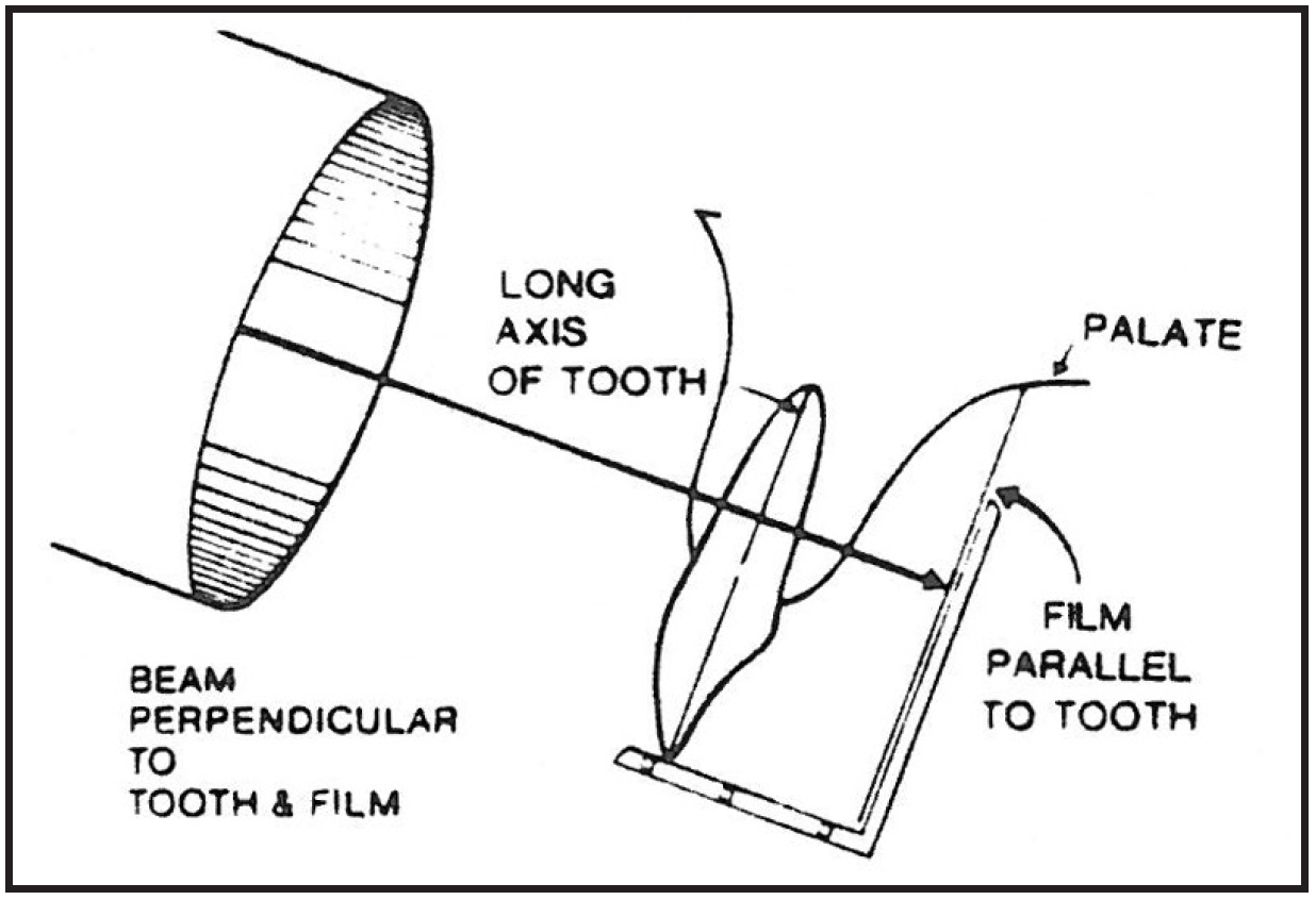 The anatomic configuration of the oral cavity determines the distance needed between receptor and tooth and varies among individuals. However, even under difficult conditions, a diagnostic quality image can be obtained provided that the receptor is not more than 20 degrees out of parallel with the tooth, and that the face of the PID is exactly parallel to the receptor to produce a central beam which is perpendicular to the long axis of the tooth and the receptor.