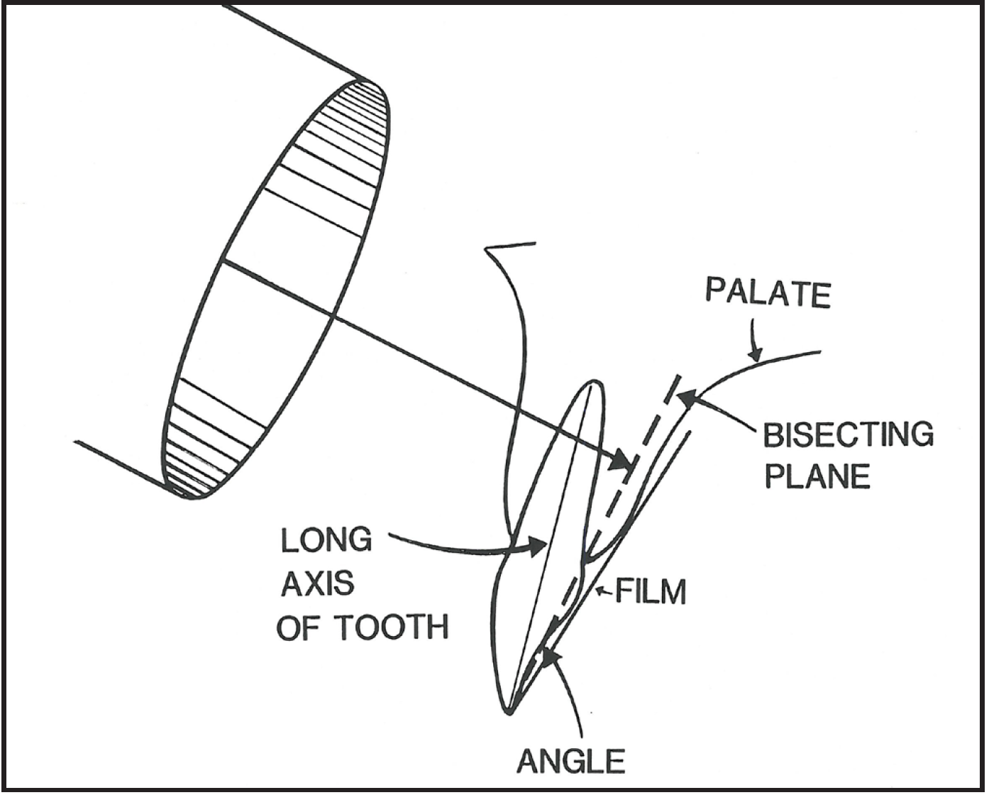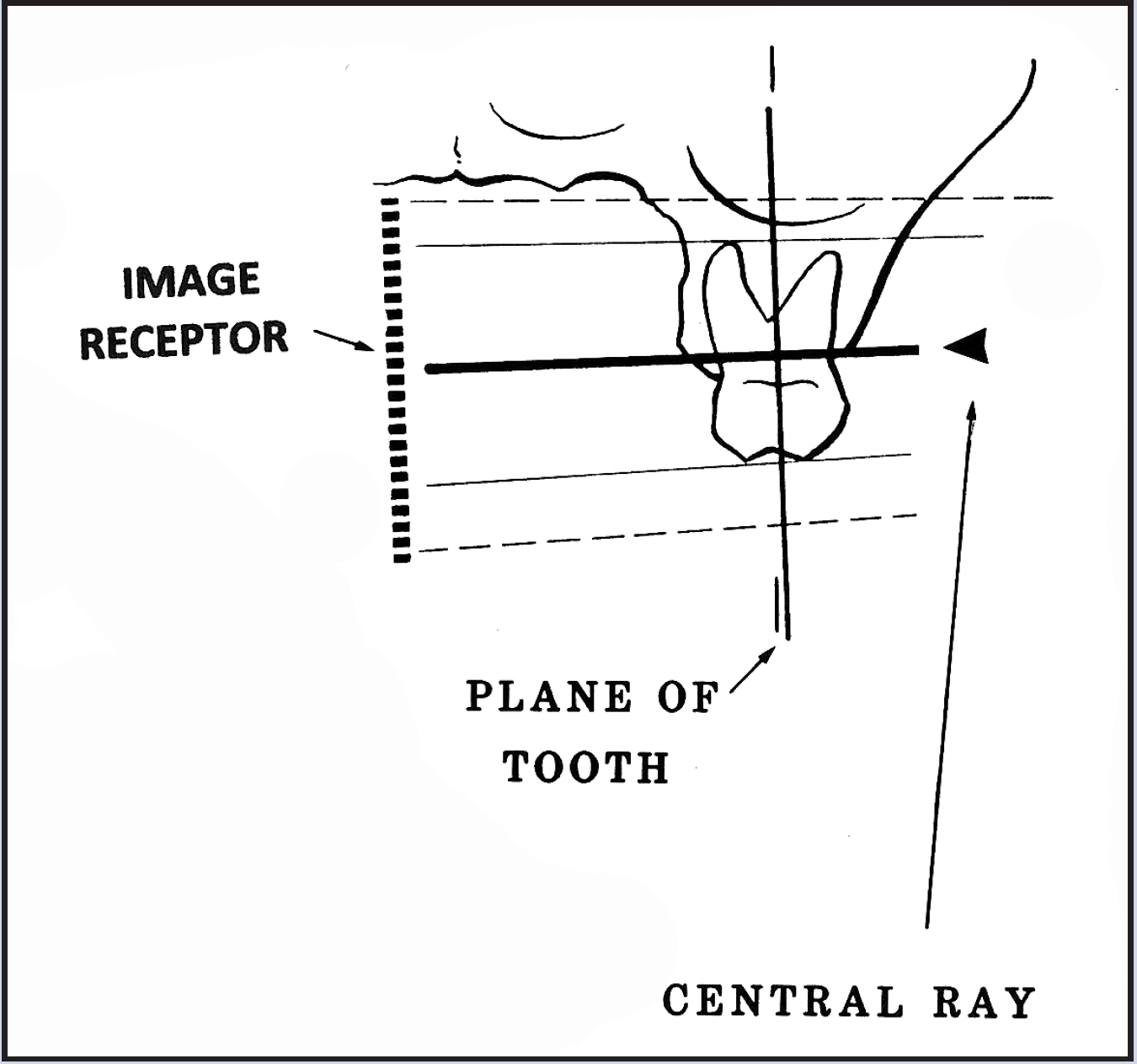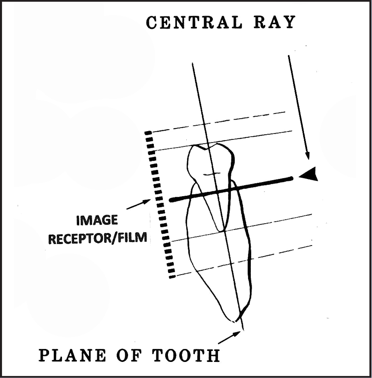 The anatomic configuration of the oral cavity determines the distance needed between receptor and tooth and varies among individuals. However, even under difficult conditions, a diagnostic quality image can be obtained provided that the receptor is not more than 20 degrees out of parallel with the tooth, and that the face of the PID is exactly parallel to the receptor to produce a central beam which is perpendicular to the long axis of the tooth and the receptor.