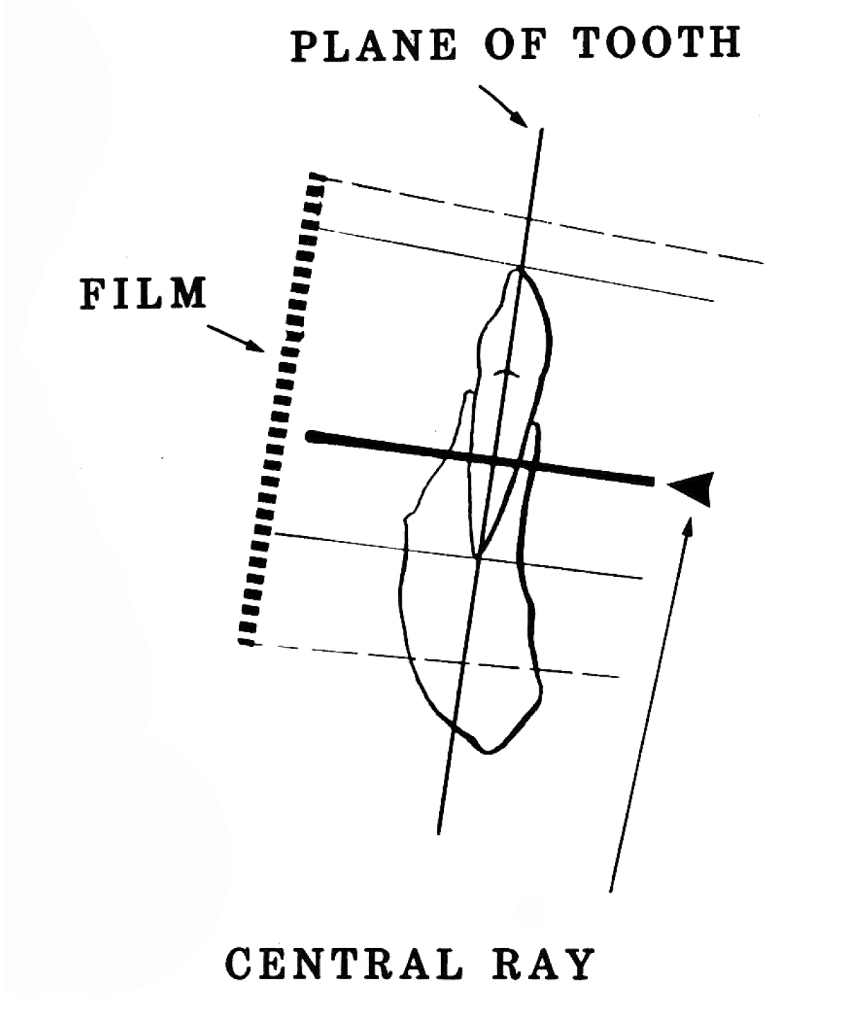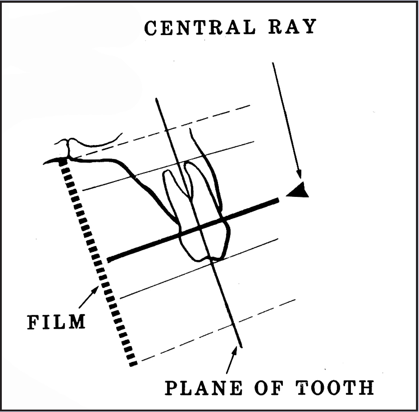 Successfully using the paralleling technique depends largely on maintaining certain essential conditions as illustrated in Figure 8. These are: 1) the receptor should be flat; 2) the receptor must be positioned parallel to the long axis of the teeth; and 3) the central ray of the radiographic beam must be kept perpendicular to the teeth and receptor.