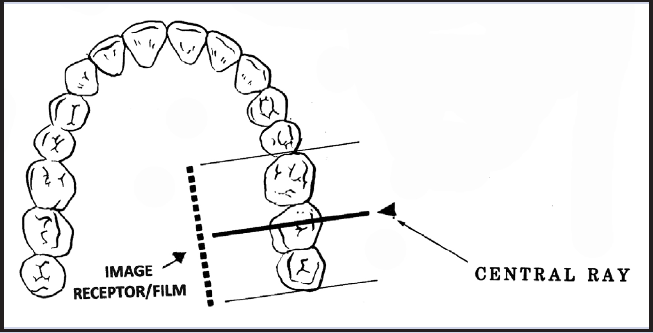 The beam's horizontal direction determines the degree of overlap among the tooth images at the interproximal spaces. When radiographing relatively aligned teeth, if the central beam is not perpendicular to the interproximal spaces, the teeth will overlap and the spaces between the contacts will close on the image. Imagine a flashlight beam approaching a picket fence at a perpendicular 90-degree angle. The spaces between the pickets will remain open in the shadow image unless the beam angle varies from perpendicular. The degree of overlapping will increase or decrease as the beam angle increases or decreases from perpendicular.
