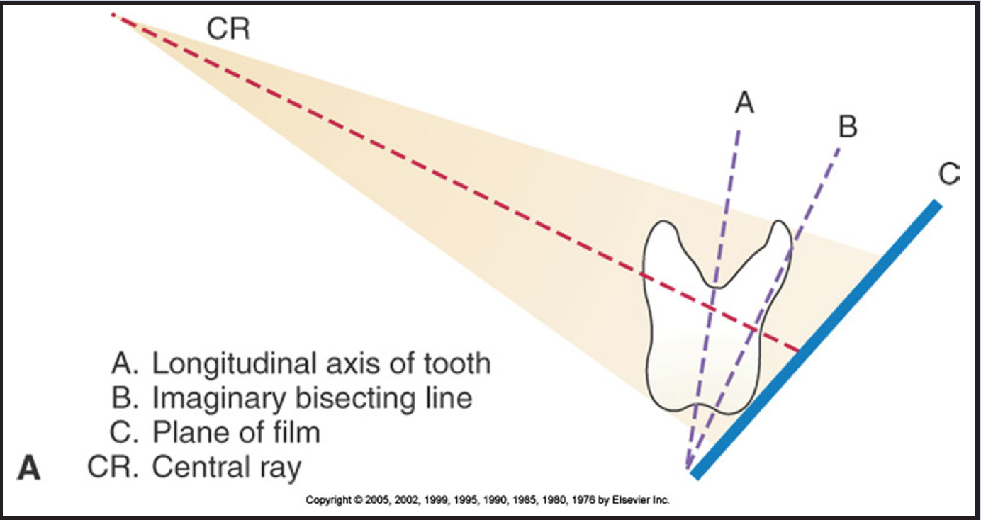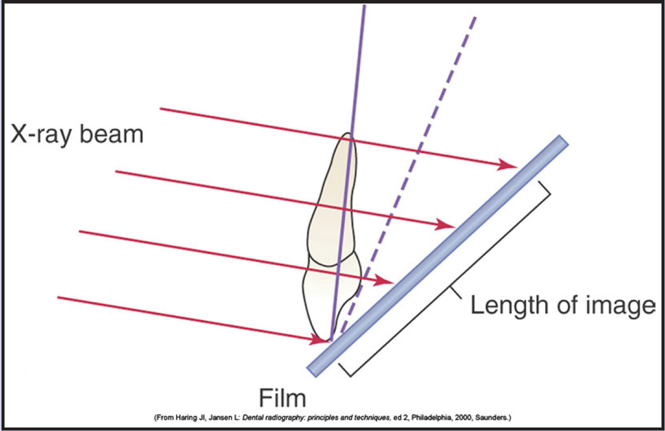 When applying the paralleling technique, the vertical angulation is the only component to maintaining the parallel plane. There is no set degree number to follow. As stated earlier under basic principles, the tooth, the receptor, and end of the position indicating device (PID) are all kept on parallel planes. If the vertical angulation is excessive, the image will appear foreshortened. Insufficient vertical angulation produces an elongated image.