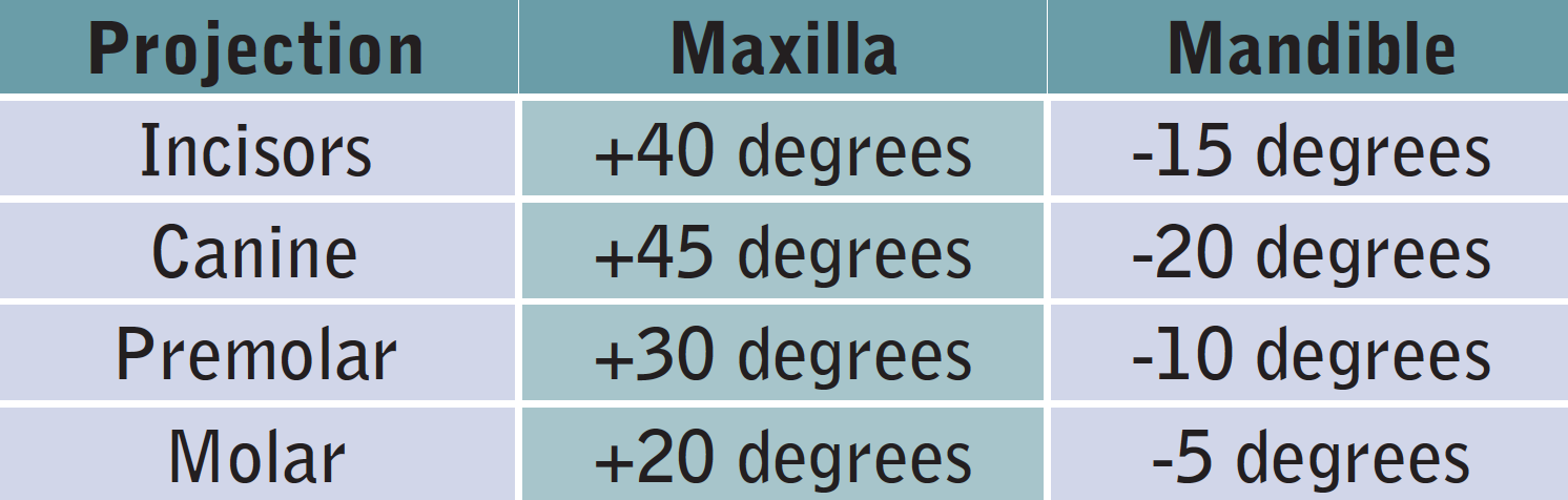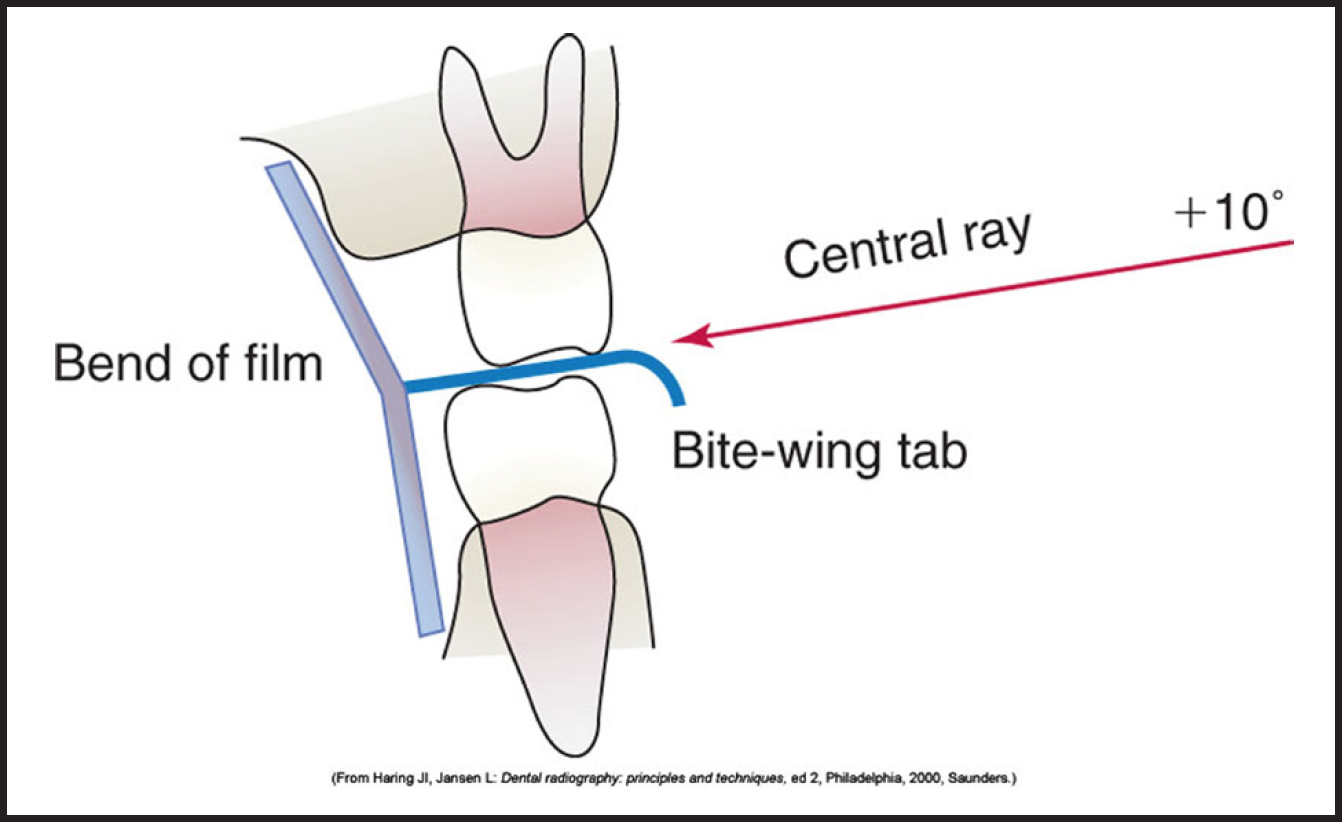 - Bitewings are exposed with a +10 angulation to compromise for the differences in the long axis angulations of the maxillary and mandibular teeth.